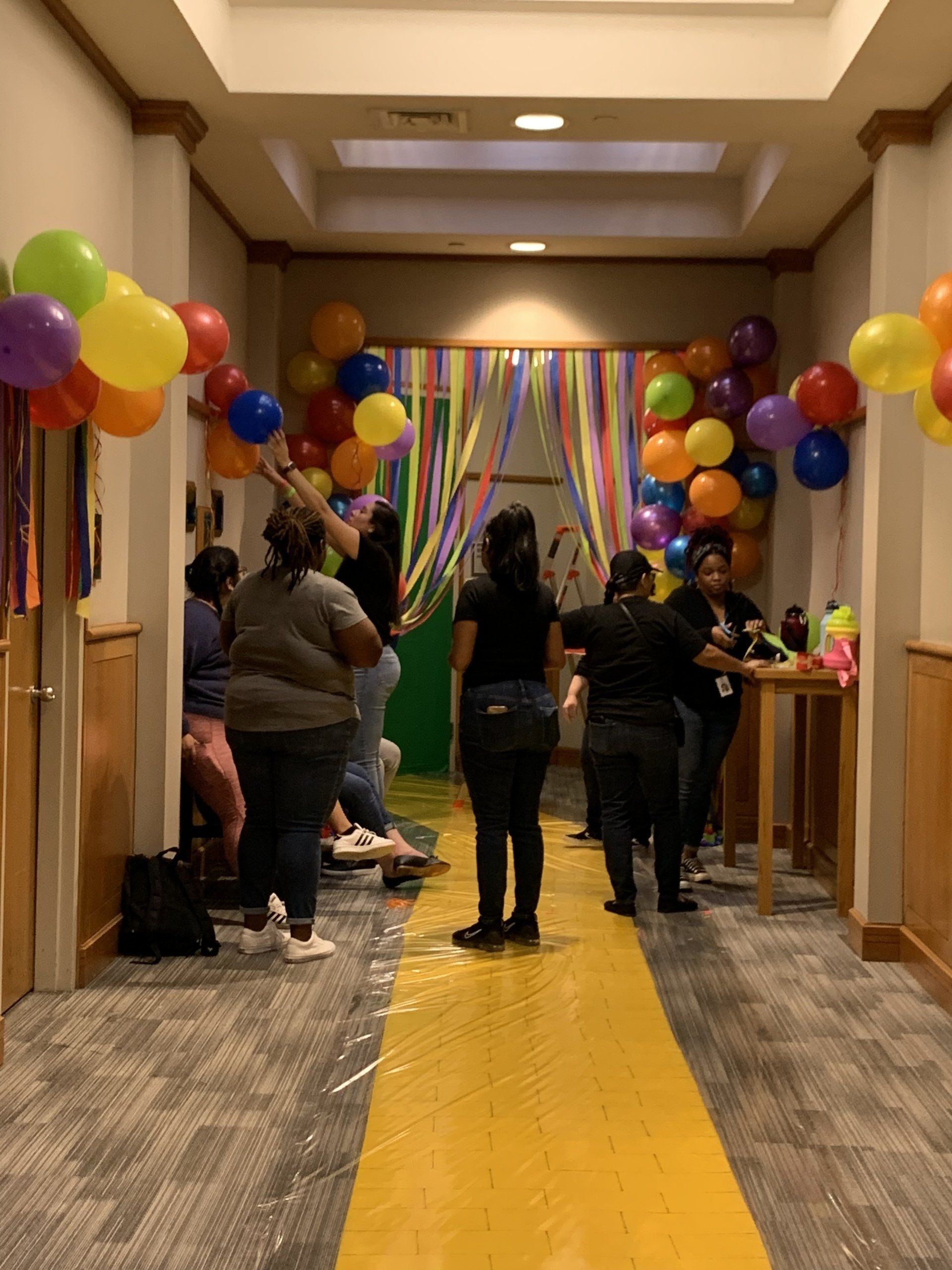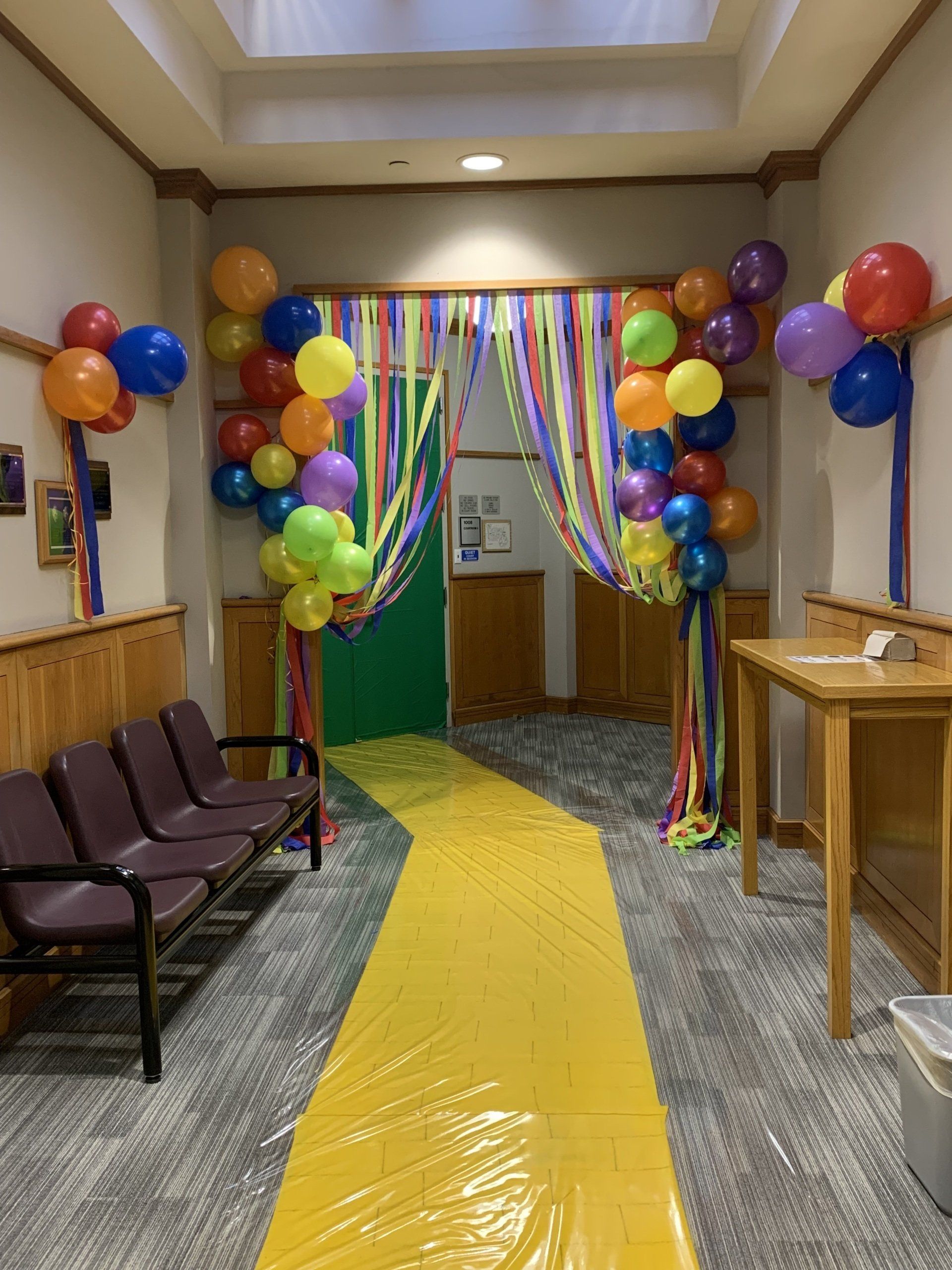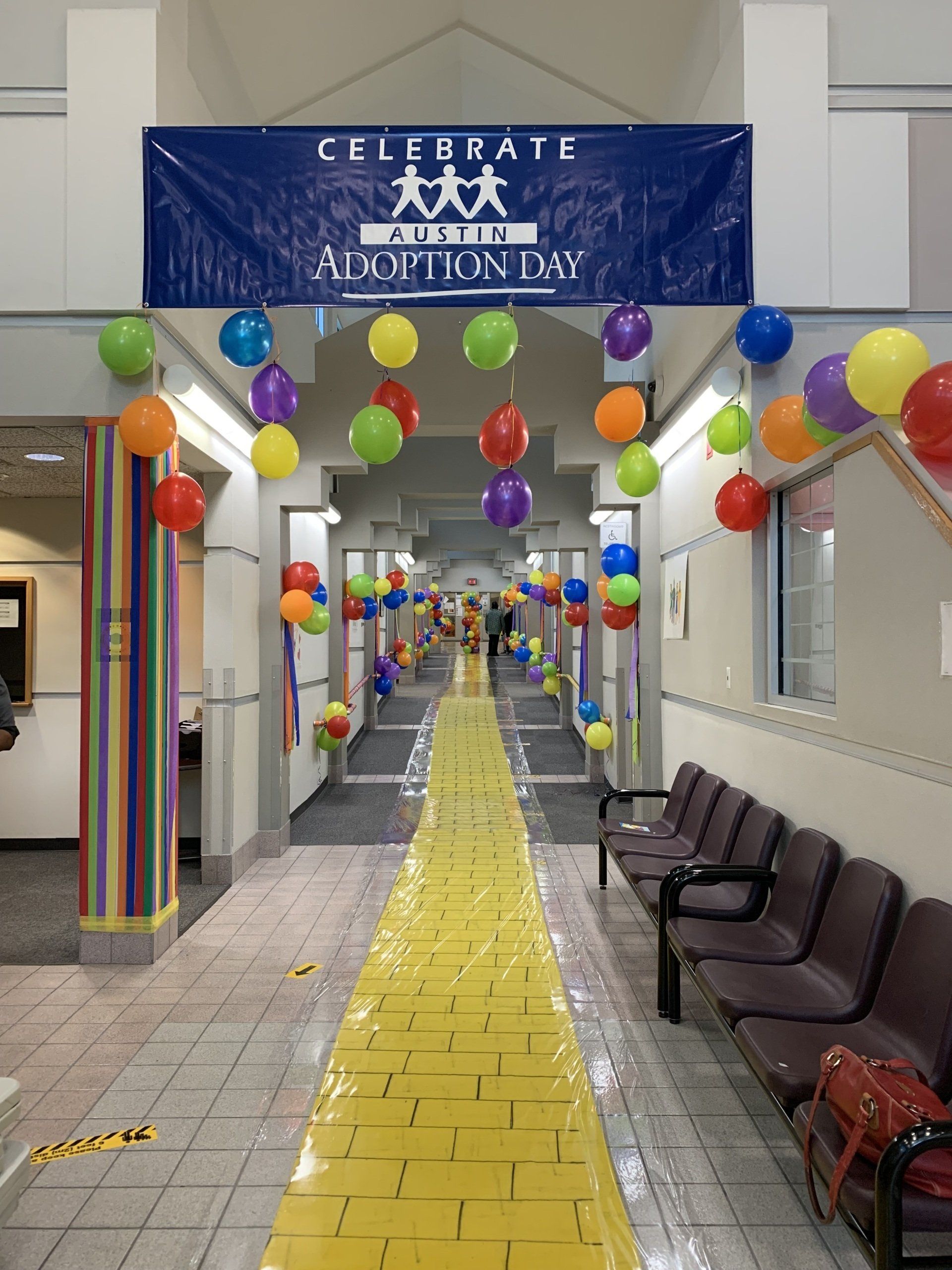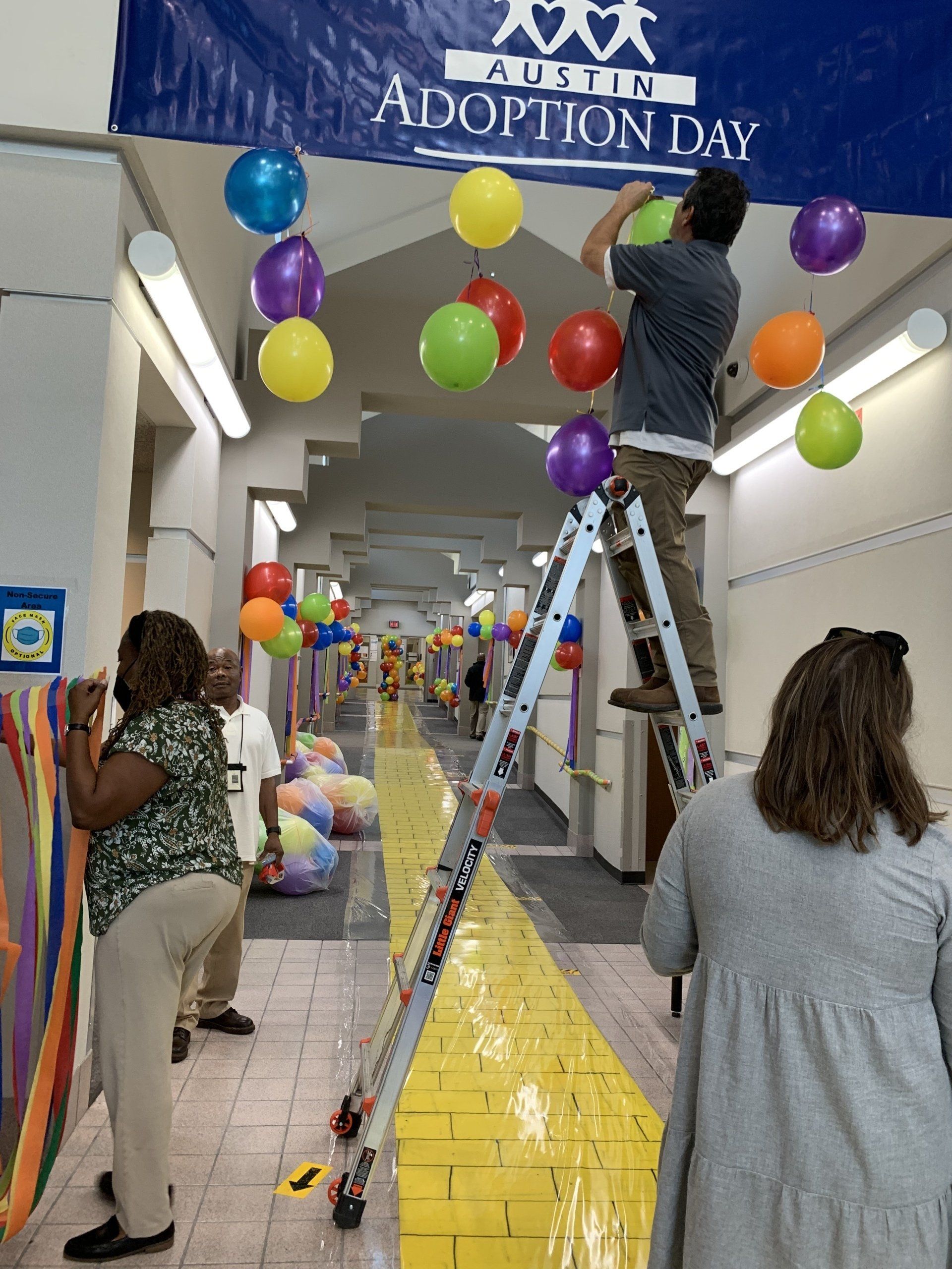 Austin Lawyers’ Auxiliary blew up tons of balloons, hung crepe paper, glue signs, decorated doors to help turn the Gardner Betts Juvenile Center into the Land of Oz for Austin Adoption Day.