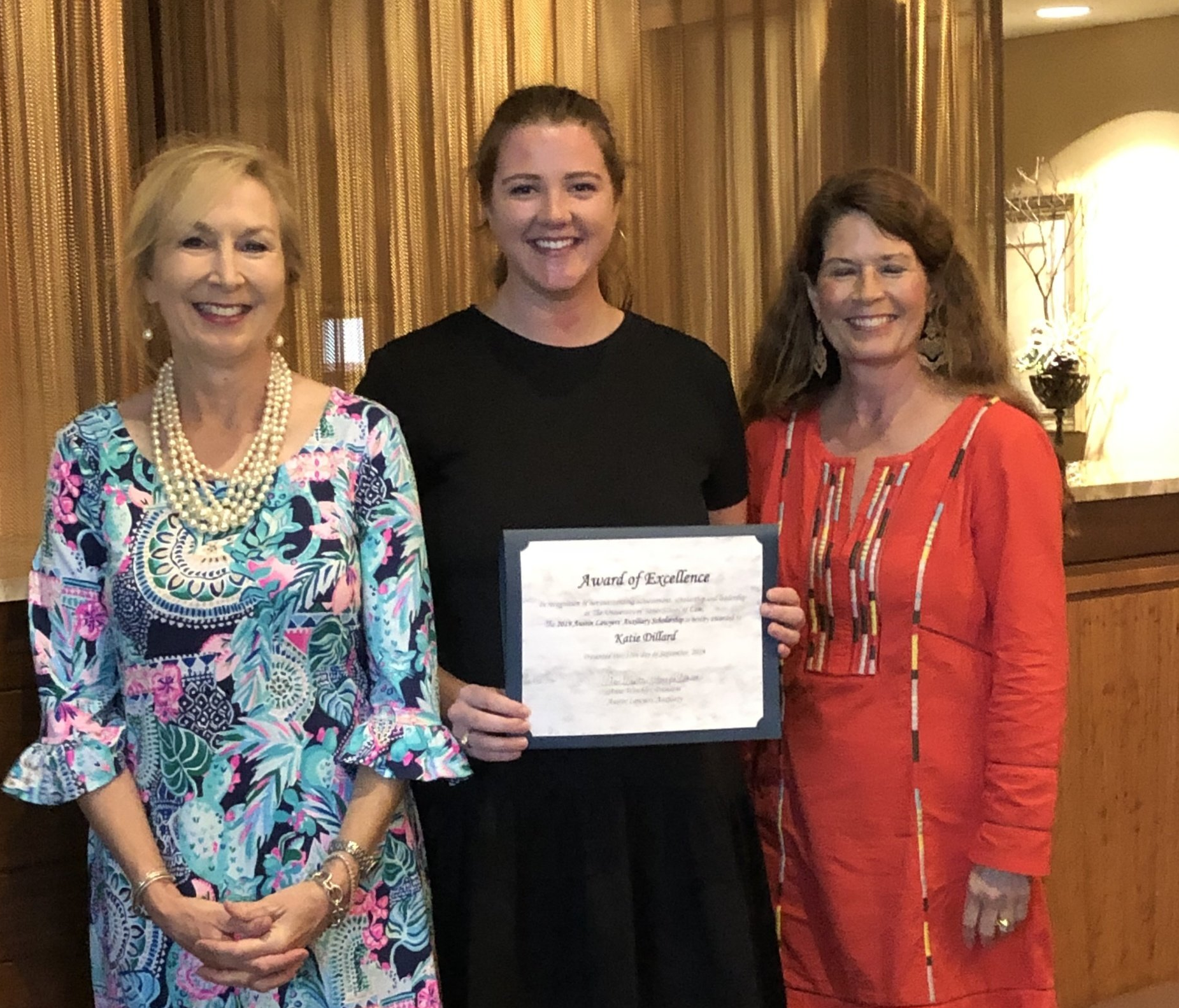 The Austin Lawyers' Auxiliary provides an annual scholarship to a female law student at the University of Texas School of law. We are proud to award a $2,000 scholarship each year. It is funded by our members who pay "annual" dues of $50. These dues only cover 42% of the scholarship amount each year.