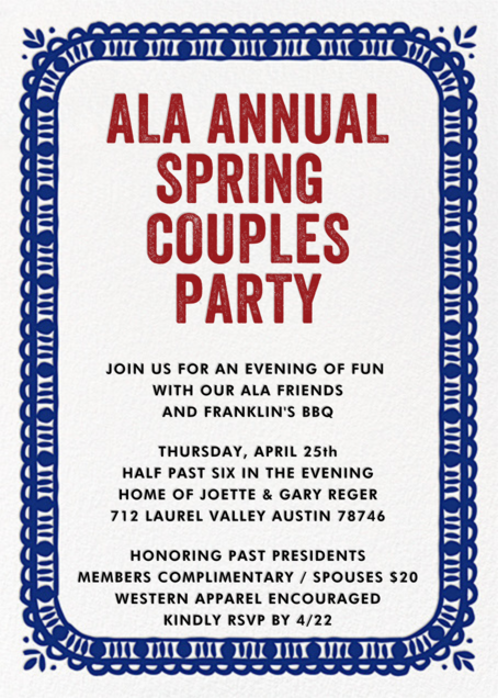 Break out those cowboy boots and hat, and join us for some Franklin's BBQ, Texas Swing, frosty beverages and great conversation!
